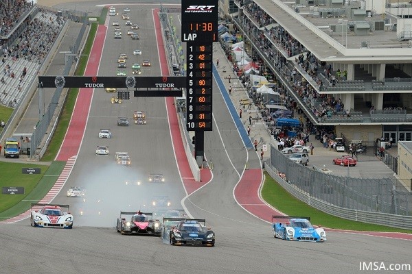 Oreca) mit im Rennen führenden Sean Rayhall (#25 8Star Oreca) in Turn 1